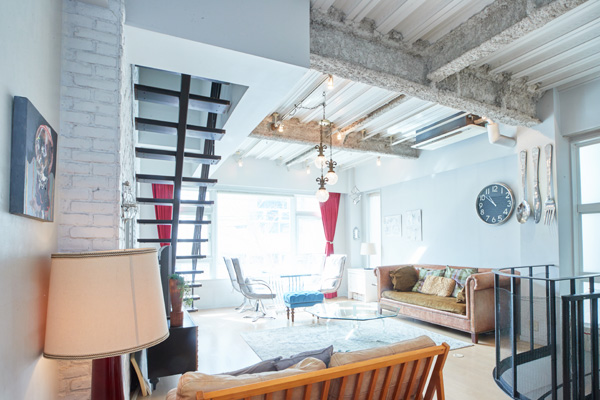 天高のリビングルームとキッチンがあり、様々な生活シーンの撮影が可能です。